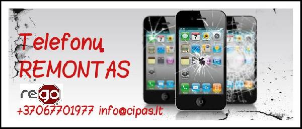 Remonto kainos priklauso nuo gamintojų, detalių tipo, kokybės. Taisome visų mobiliųjų telefonų gamintojų (Apple, Alcatel, BlackBerry, HTC, Huawei , LG, Motorola, Samsung, SonyEricsson, My-Phone, Nokia, ZTE) mechaninius bei programinius gedimus: * Krovimo gedimo remontas, išlaužto lizdo keitimas, naujo lizdo litavimas; * Dužusio, skilusio ekrano keitimas; * Slaptažodžių nuėmimas, mobiliojo telefono versijos atnaujinimas ar atkūrimas; * Mobiliojo telefono korpuso išvalymas, keitimas; * Baterijos keitimas, litavimas; * Mikrofono, garsiakalbio keitimas; * Atrišimas, lietuviško (ir kt.) meniu įdiegimas. Suteikiama garantija. MUS RASITE ADRESU: UAB Rego Tech Vilniaus g. 230, Šiauliai (patogus privažiavimas) El.p. info@cipas.lt Mob.: +37067701977 arba +37063977277 Darbo laikas: I-V: 9-18 val., VI: 9-14 val. Daugiau informacijos rasite mūsų internetinėje svetainėje: www.cipas.lt *Nuolatiniams klientams taikome NUOLAIDAS.* Kaina: 1 EUR