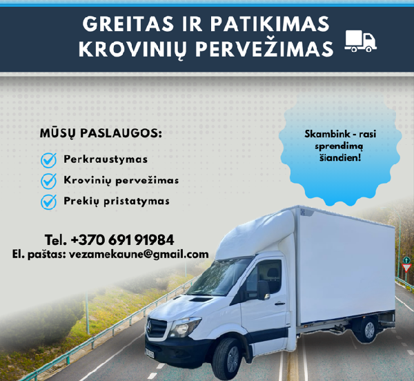 Perkraustai? Reikia pervežti baldus, buitinę techniką ar siuntinį? Mes pasiruošę padėti greitai, saugiai ir už draugišką kainą! 1. Atvykstame tą pačią dieną nereikės ilgai laukti! 2. Dirbame ir savaitgaliais prisitaikome prie jūsų laiko. 3. Malonus aptarnavimas. 4. Aiškios, draugiškos kainos. 5. Padedame pakrauti/iškrauti, galimas užnešimas. 6. Vežame Kaune ir aplink greitai ir patikimai. Turime tvarkingą krovininį automobilį su liftu (žr. nuotrauką), kad jūsų daiktai būtų pervežti saugiai ir be jokio vargo. Tel. +370 691 91984 El. paštas: vezamekaune@gmail.com Perkraustymas ir pervežimas mes pasiruošę padėti jums šiandien!