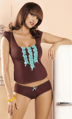 Žaisminga pižama maloniai priglunda prie kūno ir išryškina moters kūno linijas. Pižamą sudaro marškinėliai ir šortukai. Pižama papuošta žydromis dekoracijomis.