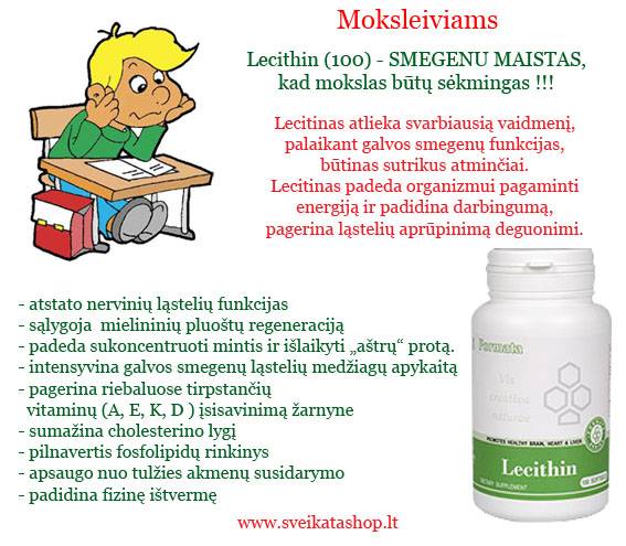 Lecitinas fosfolipidų (cholino, inozitolio ir kt.) mišinys, kuris gyvybiškai būtinas kiekvienai žmogaus organizmo ląstelei. Lecitinas yra vienas iš pagrindinių ląstelinių membranų, o taip pat galvos smegenų dangalų , raumenų ir nervinių ląstelių komponentų. Lecitinas atlieka svarbiausią vaidmenį, palaikant galvos smegenų funkcijas, būtinas sutrikus atminčiai. Lecitinas padeda organizmui pagaminti energiją ir padidina darbingumą, pagerina ląstelių aprūpinimą deguonimi. Ši medžiaga padeda įsisavinti riebaluose tirpstančių vitaminus A, D, E ir K , kurie būtini organizmo visų ląstelių mitybai. Lecitinas teigiamai veikia kepenų funkciją kaip hepatoprotektorius ir detoksikuojanti medžiaga, jo naudojimas žymiai sumažina fibrozės ir kepenų cirozės riziką, naudojant alkoholį. Lecitinas turi emulguojantį poveikį. Lecitino pagalba cholesterino ir kitų riebalų dalis virsta vandens- riebalų emulsija ir išskiriama iš organizmo. Lecitinas taip pat padidina tulžies rūgščių išsiskyrimą, kurie sintezuojami iš cholesterino, sumažindami jo kiekį kraujyje. Tokiu būdu, mažinant cholesterino kiekį, lecitinas sąlygoja širdies-kraujagyslių susirgimų profilaktiką. Lecitinas būtinas normaliam nervų sistemos funkcionavimui, aktyviai dalyvauja nervinių impulsų perdavime, naudingas, kai padidintas nervinis jautrumas. Cholinas (sudėtinė lecitino dalis) pasižymi unikalia savybe pagerinti tulžies pūslės funkciją, sąlygoja tulžies nutekėjimą ir pagerina virškinamojo trakto peristaltiką. Puikus kompanijos Santegra produktas Lecithin turi įeiti į kiekvieno racioną. Ypatingai būtinas lecitinas pagyvenusio amžiaus žmonėms, nes lecitino kiekis metų bėgyje organizme mažėja. - atstato nervinių ląstelių funkcijas - sąlygoja mielininių pluoštų regeneraciją - intensyvina galvos smegenų ląstelių medžiagų apykaitą - pagerina riebaluose tirpstančių vitaminų (A, E, K, D) įsisavinimą žarnyne - sumažina cholesterino lygį - pilnavertis fosfolipidų rinkinys - apsaugo nuo tulžies akmenų susidarymo - padidina fizinę ištvermę INDIKACIJOS: asteninė būklė, nervinio susijaudinimo padidėjimas, aukštas cholesterino kiekis kraujyje, kepenų ir tulžies pūslės funkcijos sutrikimas, padidintas kepenų krūvis (intoksikacija, antibiotikų ir alkoholio vartojimas, rūkymas).