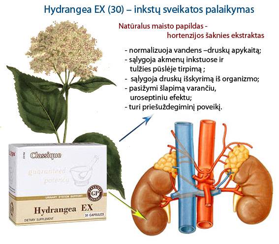 Pavadinimas hydrangea, išvertus iš graikų kalbos reiškia vandens indas ir atspindi ne tik šio puikaus augalo meilę vandeniui, bet ir jo teigiamą poveikį žmogaus organizmui vandens - druskų apykaitos normalizacijai. Hortenzijos šaknies sudėtį sudaro hidrangino glikozitas, saponinai, rutinas, flavonoidai. Nuo senų laikų hortenzijos šaknis buvo naudojama tradicinėje kiniečių medicinoje kaip valanti priemonė šlapimo išskyrimo organų uždegiminių susirgimų metu, polinkio į kristalų ir akmenų susidarymą inkstuose ir šlapimo takuose, podagros, skysčio susilaikymo organizme atvejais. Hortenzijos šaknies biologiškai aktyvios medžiagos pasižymi švelniomis šlapimą varančiomis ir žaizdų gijimą skatinančiomis savybėmis, kurios turi šlapimo ir lytinių organų sistemą valantį poveikį, sąlygoja nuodingų medžiagų iš organizmo išskyrimą, pabrinkimo sumažėjimą. Hortenzijos aktyviosios medžiagos sąlygoja šlapimo rūgšties išskyrimą iš organizmo, apsaugo nuo kristalų kaupimosi sąnariuose ir šlapimo takuose, pasižymi antimikrobiniu poveikiu naikina mikroorganizmus, kurie sukelia šlapimo išskyrimo sistemos ligas. Hortenzija naudojama kaip pagalbinė priemonė, pasireiškiant uždegiminiams procesams šlapimo takuose ir šlapimo pūslėje, sumažina gleivinės uždegimą. Sumažina spazmus šlapimo šalinimo organuose, pasižymi skausmą mažinančiu poveikiu. Hortenzijos šaknis palengvina priešmenstruacinį sindromo simptomus. Hortenzija puiki garantuota pagalbinė priemonė, lengvinanti būklę prostatos susirgimų atvejais. Hortenzija veikia inkstus tonizuojančiai, pagerina jų funkciją. ● normalizuoja vandens druskų apykaitą; ● sąlygoja akmenų inkstuose ir tulžies pūslėje tirpimą ; ● sąlygoja druskų išskyrimą iš organizmo; ● pasižymi šlapimą varančiu, uroseptiniu efektu; ● turi priešuždegiminį poveikį.