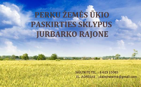 Perku žemės ūkio paskirties žemės sklypus Jurbarko rajone. Siūlykite įvairius variantus telefonu : 8 623 13083 arba el. adresu : dainorazeme@gmail.com