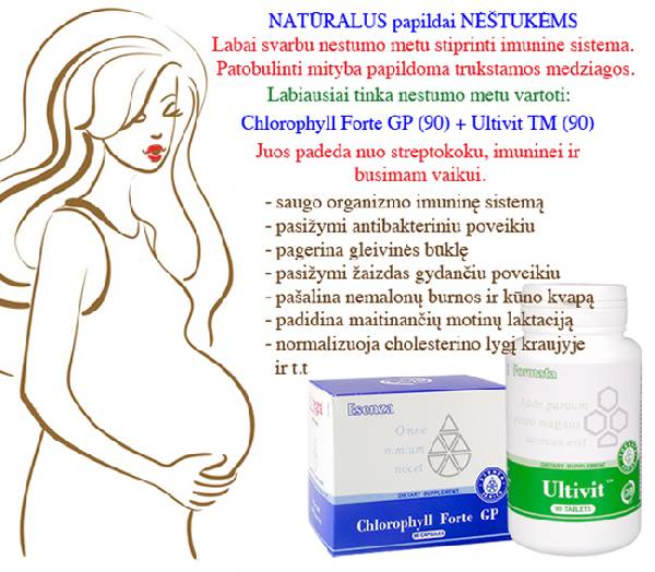 Labiausiai tinka nestumo metu vartoti: Chlorophyll Forte GP (90) ● saugo organizmo imuninę sistemą ● pasižymi antibakteriniu poveikiu ● pagerina gleivinės būklę ● pasižymi žaizdas gydančiu poveikiu ● pašalina nemalonų burnos ir kūno kvapą ● padidina maitinančių motinų laktaciją . Ultivit TM (90) ● vitaminų ir mineralų subalansuota formulė; ● normalizuoja cholesterino lygį kraujyje; ● turi antiaterosklerotinį poveikį; ● stiprina širdies raumens, galvos smegenų,akių tinklainės apytakos procesus; ● stiprina kraujagyslių sieneles, normalizuoja jų tonusą, stabilizuoja arteritį kraujospūdį; ● stiprina organizmo imuninę sistemą; ● pasižymi antioksidaciniu poveikiu; ● gerina atmintį, dėmesį, darbingumą. Juos padeda nuo streptokoku, imuninei ir busimam vaikui.