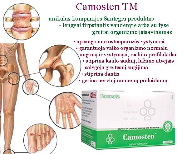 Camosten TM - unikalus kompanijos Santegra produktas, lengvai tirpstantis vandenyje arba sultyse bei greitai organizmo įsisavinamas. Kalcis, kartu su magniu, manganu ir vitaminu D, optimaliai aprūpina kaulų sistemą, pagerina dantų ir plaukų būklę. Kalcio įsisavinimas yra svarbiausias rodiklis, lyginant įvairias jo formas.