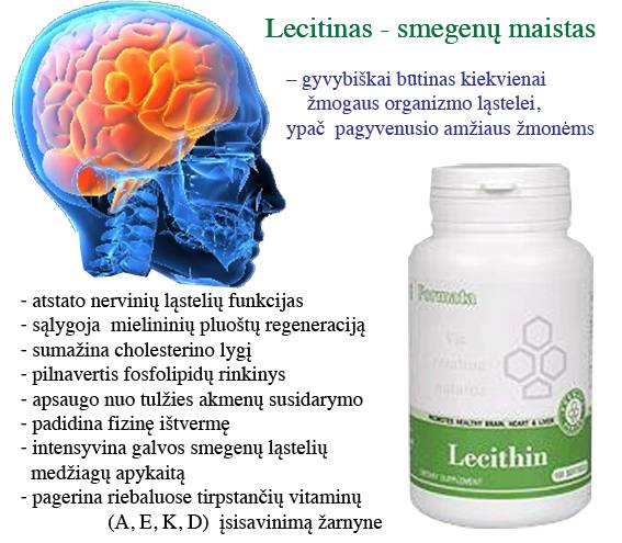 Lecitinas fosfolipidų (cholino, inozitolio ir kt.) mišinys, kuris gyvybiškai būtinas kiekvienai žmogaus organizmo ląstelei. Lecitinas yra vienas iš pagrindinių ląstelinių membranų, o taip pat galvos smegenų dangalų , raumenų ir nervinių ląstelių komponentų. Lecitinas atlieka svarbiausią vaidmenį, palaikant galvos smegenų funkcijas, būtinas sutrikus atminčiai. Lecitinas padeda organizmui pagaminti energiją ir padidina darbingumą, pagerina ląstelių aprūpinimą deguonimi. Ši medžiaga padeda įsisavinti riebaluose tirpstančių vitaminus A, D, E ir K , kurie būtini organizmo visų ląstelių mitybai. Lecitinas teigiamai veikia kepenų funkciją kaip hepatoprotektorius ir detoksikuojanti medžiaga, jo naudojimas žymiai sumažina fibrozės ir kepenų cirozės riziką, naudojant alkoholį. Lecitinas turi emulguojantį poveikį. Lecitino pagalba cholesterino ir kitų riebalų dalis virsta vandens- riebalų emulsija ir išskiriama iš organizmo. Lecitinas taip pat padidina tulžies rūgščių išsiskyrimą, kurie sintezuojami iš cholesterino, sumažindami jo kiekį kraujyje. Tokiu būdu, mažinant cholesterino kiekį, lecitinas sąlygoja širdies-kraujagyslių susirgimų profilaktiką. Lecitinas būtinas normaliam nervų sistemos funkcionavimui, aktyviai dalyvauja nervinių impulsų perdavime, naudingas, kai padidintas nervinis jautrumas. Cholinas (sudėtinė lecitino dalis) pasižymi unikalia savybe pagerinti tulžies pūslės funkciją, sąlygoja tulžies nutekėjimą ir pagerina virškinamojo trakto peristaltiką. Puikus kompanijos Santegra produktas Lecithin turi įeiti į kiekvieno racioną. Ypatingai būtinas lecitinas pagyvenusio amžiaus žmonėms, nes lecitino kiekis metų bėgyje organizme mažėja. - atstato nervinių ląstelių funkcijas - sąlygoja mielininių pluoštų regeneraciją - intensyvina galvos smegenų ląstelių medžiagų apykaitą - pagerina riebaluose tirpstančių vitaminų (A, E, K, D) įsisavinimą žarnyne - sumažina cholesterino lygį - pilnavertis fosfolipidų rinkinys - apsaugo nuo tulžies akmenų susidarymo - padidina fizinę ištvermę INDIKACIJOS: asteninė būklė, nervinio susijaudinimo padidėjimas, aukštas cholesterino kiekis kraujyje, kepenų ir tulžies pūslės funkcijos sutrikimas, padidintas kepenų krūvis (intoksikacija, antibiotikų ir alkoholio vartojimas, rūkymas).