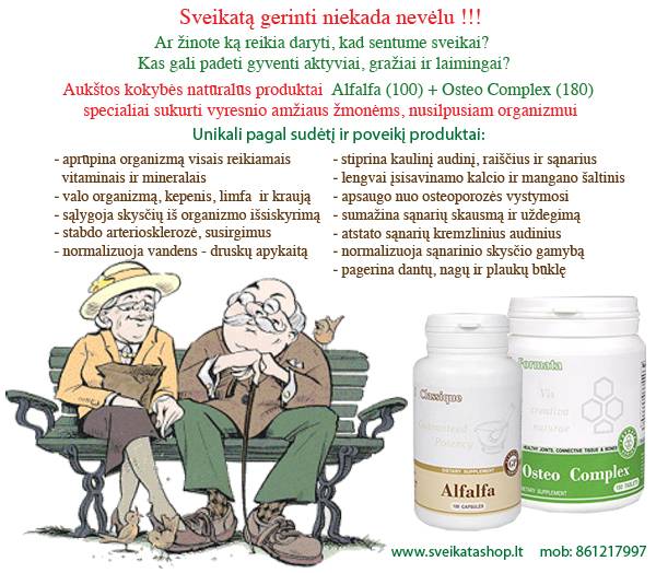 Sveikatą gerinti niekada nevėlu. Aukštos kokybės natūralūs produktai Alfalfa (100) + Osteo Complex (180) specialiai sukurti vyresnio amžiaus žmonėms, nusilpusiam organizmui. Jos padeda gyventi aktyviai, gražiai ir laimingai. Alfalfa (100) - liucerna: ● natūralus vitaminų ir mineralų kompleksas; ● valo organizmą; ● formuoja ir stiprina dantų emalę; ● valo kepenis, limfa ir kraują; ● stabdo arteriosklerozė, susirgimus; ● pagerina priešinės liaukos sekreto nutekejima; ● normalizuoja vandens- druskų apykaitą. Osteo Complex (180): ▪ stiprina kaulinį audinį, raiščius ir sąnarius; ▪ lengvai įsisavinamo kalcio ir mangano šaltinis; ▪ apsaugo nuo osteoporozės vystymosi; ▪ sumažina sąnarių skausmą ir uždegimą; ▪ atstato sąnarių kremzlinius audinius; ▪ normalizuoja sąnarinio skysčio gamybą; ▪ pagerina dantų, nagų ir plaukų būklę. Unikali produktai, pagaminti pagal paskutinius medicininius tyrimus kuri padės Jums jaustis sveikais ir žvaliais.