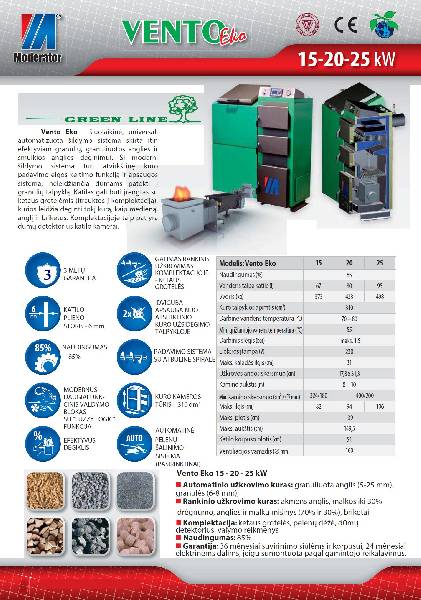 Moderator Unica Vento Eko (15-20-25 kW) - kokybiška, ekonomiška, ekologiška bei saugi šiuolaikinė, universali automatizuota šildymo sistema visoms granulių rūšims ir granuliuotai angliai, taip pat katilas pritaikytas kūrenti malkomis, briketais, bei nesmulkinta anglimi. Automatinio kuro padavimo sistemos dėka katile yra užtikrinamas ilgalaikis savarankiškas darbas ir tereikia periodiškai papildyti kurą. Granulinio kuro deginimui sumontuotas aukšto naudingumo koeficiento EKO retortinis degiklis, skirtas kūrenti tiek anglies, tiek medžio granules. Dėl savo konstrukcijos, katilas turi aukštą naudingumo koeficientą.