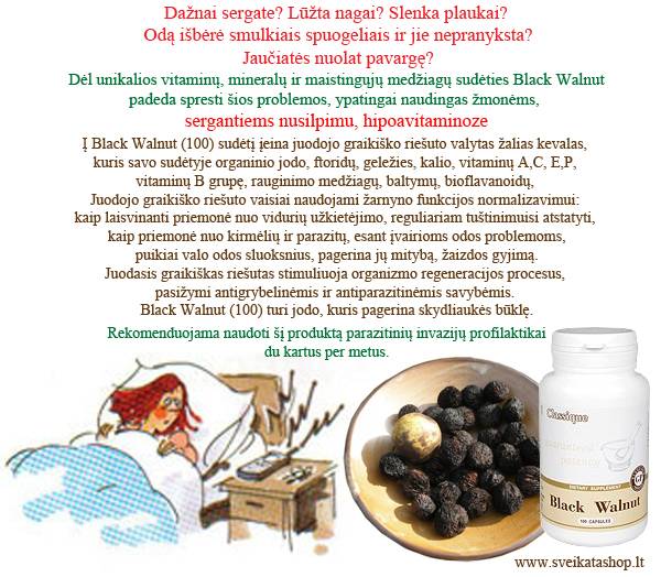 Dėl unikalios vitaminų, mineralų ir maistingųjų medžiagų sudėties Black Walnut padeda spresti šios problemos, ypatingai naudingas žmonėms, sergantiems nusilpimu, hipoavitaminoze. Į Black Walnut (100) sudėtį įeina juodojo graikiško riešuto valytas žalias kevalas, kuris savo sudėtyje organinio jodo, ftoridų, geležies, kalio,vitaminų A,C, E,P,vitaminų B grupę, rauginimo medžiagų, baltymų, bioflavanoidų. Juodojo graikiško riešuto vaisiai naudojami žarnyno funkcijos normalizavimui: kaip laisvinanti priemonė nuo vidurių užkietėjimo, reguliariam tuštinimuisi atstatyti, kaip priemonė nuo kirmėlių ir parazitų, esant įvairioms odos problemoms,puikiai valo odos sluoksnius, pagerina jų mitybą, žaizdos gyjimą. Juodasis graikiškas riešutas stimuliuoja organizmo regeneracijos procesus, pasižymi antigrybelinėmis ir antiparazitinėmis savybėmis. Black Walnut (100) turi jodo, kuris pagerina skydliaukės būklę. Rekomenduojama naudoti šį produktą parazitinių invazijų profilaktikai du kartus per metus. Black Walnut (100): - turtingas vitaminų ir mineralų šaltinis; - turi sutraukiantį poveikį; - atstato tuštinimosi reguliarumą; - pagerina virškinimą; - valo odos sluoksnius; - pagreitina žaizdos gyjimą; - stiprina dantenas ir dantis. Norintiems išsamiau sužinoti apie firmos Santegra siūlomą produkciją, nurodykite savo elektroninio pašto (arba Skype) adresą ir aš jums išsiųsiu firmos katalogą su aprašymu.