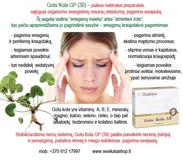 Šį augalą vadina smegenų maistu arba atminties žole, tuo pačiu apsprendžiama jo pagrindinė savybė smegenų kraujotakos pagerinimas. Deguonies atplūdis į audinius stimuliuoja ir atstato smegenų funkcijas, pagerina atmintį. Šis nepaprastas augalas turi teigiamą poveikį organizmo kraujotakos sistemai , pagerina periferinę kraujotaką, stiprina venas ir kapiliarus, normalizuoja kraujospūdį. Gotu kola stiprina venas, sumažina kraujagyslių pralaidumą, sumažina bendrą diskomfortą, kojų nuovargį ir tinimą. Gotu Kola GP (30): - pagerina atmintį, skatina mąstymo procesus; - pagerina smegenų ir periferinę kraujotaką; - teigiamai veikia varikozinių venų išsiplėtimą; - turi nedidelį sedatyvinį poveikį. Gotu kola yra vitaminų: A, B, E, mineralų: magnio, kalcio, seleno, cinko, o taip pat alkaloidų: teobromino ir kolatino šaltinis. Stabilizuodama nervų sistemą, Gotu Kola padės panaikinti nervinę įtampą ir pervargimą, pašalina stresą ir miego sutrikimus. Dar vienas svarbus Gotu kola veikimo aspektas kosmetinis efektas. Pagerėjus kraujo mikrocirkuliacijai, oda tampa lygi ir elastinga. Moksliniai tyrimai parodė, kad gotu kola pasižymi žaizdų gijimą skatinančiomis savybėmis, susijusiomis su kolageno baltymų sintezės padidėjimu. Augalas sąlygoja tinkamą užgijimą, apsaugo nuo nereikalingo randinio audinio (keloidų) susidarymo. Gotu kola sąlygoja organizmo energetinių resursų atstatymą, pagerina savijautą. Dėmesio vertas gotu kola teigiamas poveikis arteriniam spaudimui, taip pat protiniai veiklai, ypač senyvame amžiuje. SUDĖTIS (viena kapsulė) gotu kola lapai (Centella asiatica ) 370 mg. INDIKACIJOS: smegenų kraujotakos sutrikimai, atminties pablogėjimas, galvos svaigimas, varikozinis venų išsiplėtimas, klimakteriniai simptomai, miego sutrikimai, nervingumas, stresas, žaizdos, apdegimai, įsipjovimai, kosmetinės operacijos. KONTRAINDIKACIJOS: individualaus netoleravimas. Atsargiai naudoti asmenims, kurių žemas kraujo krešėjimas. NAUDOJIMAS: po 1-2 kapsules per dieną, užsigeriant stikline vandens. PAKUOTĖ: 30 kapsulių.