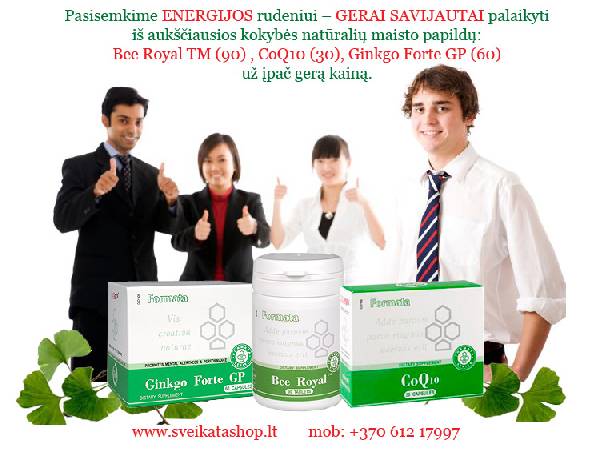 Iš aukščiausios kokybės natūralių maisto papildų: Bee Royal TM (90) , CoQ10 (30), Ginkgo Forte GP (60) už įpač gerą kainą.