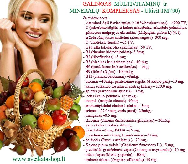 Tais atvejais, kai mes valgome per mažai sveiko ir per daug perdirbto maisto, kuriame mažai mūsų organizmui reikalingų medžiaugų, vartojami vitaminai ir mineralai tarsi užpildo mitybos spragas. Multivitaminų ir mineralų kompleksas sukurtas patenkinti kasdieninius vitaminų ir mineralų poreikius. Jo sudėtyje yra: - vitaminai A (iš žuvies taukų, 10 % betakarotinas) 4000 TV, - C (askorbino rūgštis ir kalcio askorbatas, arkorbilo palmitatas, plikosios malpigijos ekstraktas (Malpighia glabra L) (4:1), - erškėtrožių vaisių milteliai (Rosa rugosa)- 300 mg, - D (cholekalciferolis) 65 TV, - E (d-alfa tokoferolio sukcinatas)- 50 TV, - B1 (tiamino hidrochloridas)- 3,5mg, - B2 (riboflavinas) 5 mg; - B3 (niacinas ir niacinamidas) 10 mg; - B6 (piridoksino hidrochloridas) 5mg, - B9 (folinė rūgštis) 100 mkg, - B12 (cianokobalominas) 8mkg, - biotinas 10mkg, pantetoninė rūgštis (d-kalcio pantotenatas) 10 mg; - kalcis (dikalcio fosfatas ir austrių kalcis) 120.0 mg; - geležis (karbonilinė geležis) 1mg, - jodas (kalio jodidas)- 125 mkg, - magnis (magnio citratas)- 40mg, - aminorūgštiniai chelatai : cinkas 3mg, - selenas 25.0 mkg, varis (med)- 25mkg, - manganas 0.5 mg; - chromas (chromo dinikotinatas glicinatas) 20mkg; - kalis (kalio citratas) -40 mg, - cholino bitartrato 72.5 mg, - inozitolas 4 mg, PABA 25 mg, - L-cisteinas 20.3 mg, L-metioninas 20 mg, - pelžiedis (Ruscus aceleatus ) 20 mg, - Kajeno pipiro vaisiai (Capsicum frutescens L.) 5 mg, - gudobelės graužel. uogos (Crataegus axyacantha) 15 mg, - mėtos lapas (Menta piperita) 10mg, - imbiero šaknis (Zingiber officinale)- 10 mg. Vartojimas: po vieną tabletę per dieną valgio metu arba po valgio, užsigeriant stikline vandens. Vartojimo trukmė -1,5 2 mėnesiai. Kaina: 28 EUR