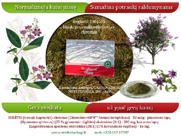 SUDĖTIS (vienoje kapsulėje): chromas (Chromium+GPM formos kompleksas) -50 mkg; gimnemos lapų (Gymnema sylvestre) (25 % gymnemic rūgšties) ekstraktas (6:1) -200 mg, krausvos lapų (Lagerstroemia speciosa) ekstraktas (20:1) (1% korosolinės rūgšties)-16 mg. INDIKACIJOS: perteklinė kūno masė, medžiagų apytakos sutrikimai, chroniško nuovargio būsena, padidėjęs gliukozės lygis kraujyje, naudojamas sportininkų sausos raumenų masės padidėjimui. KONTRAINDIKACIJOS : individualus netoleravimas. NAUDOJIMAS: po 1 kapsulę per dieną prieš valgį, užgeriant stikline vandens. Vartojimo laikas- 1-2 mėnesiai. PAKUOTĖ: 60 kapsulių. Gamintojas: Santegra, Garden State Nutritionals, INC., USA Norintiems išsamiau sužinoti apie firmos Santegra siūlomą produkciją, susisiekite su manimi, ir aš jums išsiųsiu firmos katalogą su aprašymu. Kaina: 18 EUR