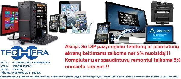 Ar nusibodo stringantis kompiuteris, užsikertantis spausdintuvas, o gal net neveikianti skanavimo mašina? Ar lėtai veikiantis išmanusis telefonas? O gal sudužo planšetinio kompiuterio ekranas? Ne bėda! Jums norime pasiūlyti įvairių kompiuterių remontą, jų techninę ir programinę priežiūrą, nemokamas konsultacijas. Remontuojame spausdintuvus, skanavimo mašinas, prižiūrime jų techninę būklę. Taip pat taisome išmaniuosius telefonus ir planšetinius kompiuterius, keičiame sudužusius ekranus, šaliname programinės įrangos sutrikimus. Visada galėsime pateikti konkurencingas kainas, o jei ir reiks, sudaryti remontų sutartis.! Iškilus klausymams ar nesklandumams, sprendžiame viską efektyviai ir greitai nuotoliniu būdu,o jei nepavyksta, atvykstame į vietą. Visiems savo darbams suteikiam 6 mėnesių garantiją. Nevarkit ir kreipkitės! Jūsų problemos - bus mūsų! Taip pat įmonėms siūlome sąskaitos atidėjimą iki 14 dienų. Dėl platesnės informacijos ir kainų prašome kreiptis telefonais ar elektroniniu paštu: Paulius - +37060900900 Jonas - +37060911305 Email info@techera.lt Skype techera_ Adresas - Pramonės pr. 6, LT-51267 Kaunas Facebook`as Techera,MB Geros jums dienos. Pagarbiai Techera kolektyvas. Kaina: 1 EUR