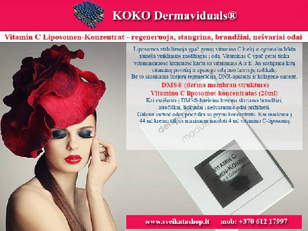 Jis sustiprina kitų vitaminų poveikį ir apsaugo odą nuo laisvųjų radikalų. Be to skatinama barjerų regeneracija, DNR-apsauga ir kolageno sintezė. Kai maišoma į DMS®-bazinius kremus skiriama brandžiai, atrofiškai, linkusiai į nešvarumus odai prižiūrėti. Galima vietinė odos priežiūra su grynu koncentratu. Kai maišoma į 44 ml kremo talpas maximum naudoti 4 ml vitamino C-liposomų. Geriausia KAINA: http://sveikatashop.lt/VitaminoC.html DRAUGAUKIME: https://www.facebook.com/dermaviduals.kosmetika Kaina: 15 EUR