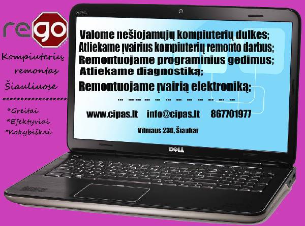 Nuo 10 Valome dulkes; Remontuojame nešiojamuosius kompiuterius; Taisome stacionarius kompiuterius; Remontuojame vaizdo kameras, fotoaparatus; Taisome programinės įrangos klaidas; Prekiaujame detalėmis ir komponentais. Jei iškilo problemų su kompiuteriu: lėtai veikia, nebeveikia, atsirado išorinių ar vidinių pažeidimų; Jei iškilo kitų problemų su elektrotechnika; Jei reikia tik konsultacijos; Jums visada pasiruošę padėti kvalifikuoti UAB Rego Tech technikos centro darbuotojai. PASTABA: Jei turite klausimų, susisiekite nurodytais kontaktais: +370 639 77277 arba +370 677 01977, arba el.paštu info@cipas.lt. Priežiūros centro darbuotojai kuo skubiau suteiks Jums kvalifikuotą pagalbą. Adresas: Vilniaus g. 230, Šiauliai. El. Puslapis: www.cipas.lt Kaina: 10 EUR