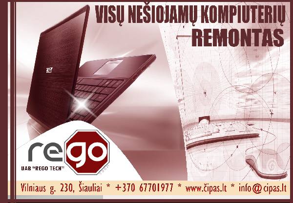 Atliekame programinį ir mechaninį kompiuterių remontą. Žemiausiomis kainomis, greitai ir kokybiškai sutaisysime kompiuterį NESVARBU, KOKS GEDIMAS MES JĮ PAŠALINSIME. Atliekame Apple kompiuterių iMac, MacBook, MacBook Air, MacBook Pro, MacMini, iPad remonto darbus: * Apple kompiuterių pagrindinių plokščių ir kitų komponentų remontas, keitimas; * Aplietų įvairiais skysčiais kompiuterių valymas, plovimas ultragarsine vonele; * Ekrano diagnostika, remontas, keitimas; * Klaviatūros valymas, remontas, keitimas; * MAC operacinės sistemos perašymas, aptarvimas; * Programų skirtų MAC komiuteriamas diegimas; * Operatyviosios atminties (RAM) didinimas; * Kietojo disko diagnostika, remontas, keitimas; * Duomenų atstatymas, atkūrimas; * Lituojame įkroviklių laidus bei kištukus; * Valome dulkes, sutepame ir išvalome garsiai dirbančius aušintuvus; * Lituojame (keičiame naujais) BGA čipus; Savo atliktiems darbams suteikiame NET iki 6 MĖN. GARANTIJĄ. Daugiau apie mūsų teikiamas paslaugas www.cipas.lt; Parduotuvėje: Vilniaus g. 230, Šiauliai; Susisiekite: El.p. info@cipas.lt; Skype: rego-gps; Mob.: 863977277; Darbo laikas: I-V: 9-18 val., VI: 9-14 val. Kaina: 10 EUR