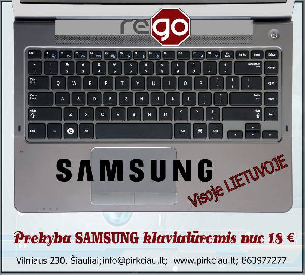 Daugiau informacijos: www.pirkciau.lt info@pirkciau.lt Parduodame įvairių modelių SAMSUNG klaviatūras. Ne visi modeliai nurodyti. SAMSUNG N150, N148, N128, N140, N145, NB30 NP-N148 (balta); SAMSUNG N150, N148, N128, N140, N145, NB30 NP-N148 (juoda); SAMSUNG R518, R519, NP-R519, NP-R518; Samsung NP300E5E, NP350E5C, NP350V5C, NP355E5C, NP355V5C; Samsung NP300E5E, NP350E5C, NP350V5C, NP355E5C, NP355V5C; SAMSUNG X418, X420, NP-X420, NP-X418 serija; SAMSUNG X520, NP-X520; SAMSUNG NP-R530, NP-R620, RV510, S3510, E352; SAMSUNG (su dangčiu) SF510, NP-SF511, RF511, QX530, NP-SF510, RF510; SAMSUNG R718, NP-R718, R720, NP-R720, R728, NP-R728, R730, NP-R730; SAMSUNG 300E4A, 300V4A, NP300E4A, NP300V4A ; SAMSUNG (su dangčiu) R530, R528, R510, RV510, R525, RV508; SAMSUNG RV511, RV515, RV520, NP-RV511, NP-RV515, NP-RV520; SAMSUNG R518, R519, NP-R519, NP-R518; SAMSUNG (su dangčiu) NP 300V5A, NP305V5A, 300V3A, 300V4A, 305V4; SAMSUNG (su dangčiu) SF510, NP-SF510, RF510, RF511, QX53; SAMSUNG NP RV511, RV515, RV520; SAMSUNG (su dangčiu) NP300E5A, NP305E5A, NP300V5A, NP305V5A; SAMSUNG 730U3E, NP730U3E, 740U3E, NP740U3E; SAMSUNG NP RV511, RV520, RV515; SAMSUNG (su rėmeliu) NP300E5E, NP350E5C, NP350V5C, NP355E5C, NP355V5C, BA59-03271A; SAMSUNG (su dangčiu) SF510, NP-SF511, RF511, QX530, NP-SF510, RF510; SAMSUNG R580, R590, BA59-02680A, NP-R580, NP-R590; SAMSUNG R510, R60, R70; SAMSUNG R728, NP-R728, R730, NP-R730; Taip pat siūlome įsigyti ir kitų gamintojų: ACER, APPLE, ASUS, DELL, FUJITSU, HP, LENOVO, MSI, PACKARD BELL,SONY, TOSHIBA įvairių modelių klaviatūrų. Daugiau prekių ir informacijos rasite: www.pirkciau.lt; Vilniaus g. 230, Šiauliai; El.p. info@pirkciau.lt; Skype: rego-gps; Mob.: 863977277; Darbo laikas: I-V: 9-18 val., VI: 9-14 val. Kaina: 18 EUR