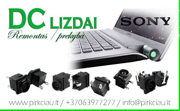 Įvairūs SONY pakrovimo; įkrovimo; maitinimo DC lizdai nešiojamiesiems kompiuteriams. SONY ir kitų lizdų keitimas. Daugiau informacijos: www.pirkciau.lt; SONY PCG-FXA series (PCG-FXA32, PCG-FXA33, PCG-FXA35, PCG-FXA35/D, PCG-FXA36, PCG-FXA47, PCG-FXA48, PCG-FXA49, PCG-FXA53, PCG-FXA59, PCG-FXA63) PCG-GR300. SONY PCG-GRS series (PCG-GRS100, PCG-GRS100K, PCG-GRS150, PCG-GRS150K, PCG-GRS150P, PCG-G. SONY Vaio PCG-717 PCG-719 PCG-705E PCG-505G PCG-505GX PCG-505X PCG-9G1L . SONY vaio PCG-7A2L PCG-7D2L. SONY Vaio PCG-K22p PCG-K23 PCG-K25 PCG-K27. SONY Vaio PCG-N Series PCG-NVR5K, PCG-NVR7K, PCG-NVR17, PCG-NVR23, PCG-NVR27, PCG-NVR33, PCG-N505, PCG-N170, PCG-N190, PCG-N200, PCG-N290, PCG-NV105, PCG-NV109M, PCG-NV170, PCG-NV170P, PCG-NV190, PCG-NV290. SONY Vaio T13 SVT13 Z30UL. SONY Vaio VGN-CR190 VGN-CR190E VGN-CR190EB. SONY Vaio VPCS VPC-S Series. SONY Vaio: VGN-S, VGN-SR, VGN-FE Series. SONY Vaio:VGN-N130G VGN-NR220E, VGN-NR220E/S, VGN-NR240E. SONY VGN- TZ VGN-C SR NW series: VGN-NW200 series VGN-7141L VGN-C 150 P/B, VGN-C 190 G, PCG-6P1 L. SONY VGN-FS VGN-N VGN-NV Series. Visos dalys naujos, galime pakeisti mūsų servise. Siunčiame į kitus miestus. www.pirkciau.lt galite rasti ir kitų nešiojamų kompiuterių dalių. www.pirkciau.lt; Vilniaus g. 230, Šiauliai; El.p. info@pirkciau.lt; Skype: rego-gps; Mob.: 863977277; Darbo laikas: I-V: 9-18 val., VI: 9-14 val Kaina: 3 EUR