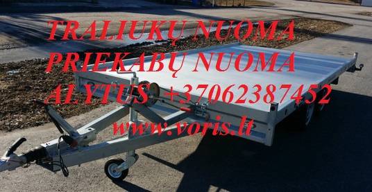 TRALIUKO/PLATFORMOS/PRIEKABOS NUOMA ALYTUS! https://www.facebook.com/TRALIUKONUOMA +37062387452 PLATFORMOS NUOMA ! PLATFORMOS MATMENYS: ILGIS 4.50m PLOTIS 2.10m. Keliamoji galia 2400kg +37062387452 ( Patogu vežti lentas, kubilus, metalo gaminius, traktoriukus, žoliapjovės, valtis, automobilius, keturačius ir t.t. ) PRIEKABOS NUOMA! PRIEKABOS MATMENYS: ( su tentu aukštis nuo grindų 1.80m. ) ILGIS 3.00m PLOTIS 1.50m. Keliamoji galia 750kg +37062387452 TRALIUKO NUOMA! TRALIUKO MATMENYS: ILGIS 4.50m PLOTIS 2.08m. Keliamoji galia 2140kg. +37062387452 TECHNINĖ PAGALBA KELYJE +37062387452 Turime galimybę išduoti (priimti) priekabas bet kuriuo paros metu, ne darbo dienomis. UAB VORIS +37062387452 +37067247506 +37064614499 ALYTUS http://www.voris.lt ( Alytus NUOMA ) Priekabų Nuoma, Traliukų Nuoma : tel. +37062387452 I-VII VISĄ PARĄ (Pirmadienis-Sekmadienis 00:00-24:00 ) Adresas: Likiškėlių k., Alytaus raj. SKULO degalinė Atvykimą maloniai prašome suderinti prieš 10-15min. Savaitgaliais prieš 30min. Tech.pagalbos paslaugos SU TECHNINE PAGALBA pervežam automobilius Lietuvoje ir už jos ribų. +37062387452 +37067247506 +37064614499 Daugelis jau žino, kad pasikeitė laikinųjų (vadinamųjų raudonų) numerių naudojimo tvarka: taisyklės buvo labai sugriežtintos, padidintos baudos, todėl keliuose tokių automobilių beveik nebeliko. Taigi, ką daryti, jei automobilį perkate kitame mieste ir registravimo valandos pasibaigusios? Mūsų nuomos punkte galima išsinuomoti ir specialų traliuką, skirtą automobiliams transportuoti", sakė A. Kaminskas. Dviašiu traliuku galima transportuoti visus automobilius ar visureigius, kurių svoris yra iki 2 150 kg. Ant naujų traliukų sumontuoti specialūs stabdžiai, traliukai yra nauji ir apdrausti. Taigi prireikus partempti automobilį, pavyzdžiui patekusį į eismo įvykį, verta pagalvoti, ar nebūtų saugiau prisikabinti traliuką ir taip automobilį transportuoti iš vieno taško į kitą. Dviašio traliuko nuomai ir eksploatavimui reikalingos BE kategorijos teisės. TEL. +37062387452 Kaina: 20 EUR