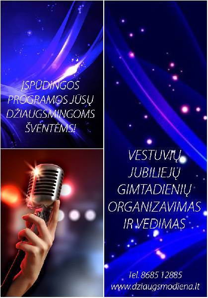 Nuotaikinga šventės vedančiojo programa kaip tik Jums! Mūsų tikslas - džiaugsminga Jūsų gyvenimo šventė. Organizuojame ir vedame teminius gimtadienius, išleistuves, mergvakarius, vestuves, kalėdinius ir naujametinius renginius su linksmais vedančiaisiais ar išradingais animatoriais. Susisiekite su mumis ir mes su džiaugsmo kupina programa atvyksime pas Jus į namus, kavinę, darželį, mokyklą ar kitą Jūsų pasirinktą vietą Klaipėdos mieste ir rajone. Aplankykite mus www.dziaugsmodiena.lt ir kartu suorganizuokime pačią nuostabiausią gyvenimo šventę!