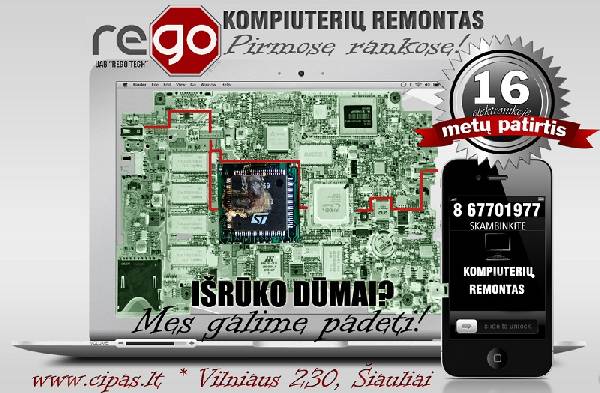 Naudojantis kompiuteriu staiga pajutote degėsių kvapą? Vadinasi iš Jūsų kompiuterio išlindo Jūsų nekviestas džinas. Kai taip nutiko Jums, mes patariame kuo skubiau išjungti kompiuterį iš maitinimo lizdo, ištraukti bateriją, nepadarius to yra didžiulė tikimybė, kad perdegs lustas ar procesorius. Po nekviesto svečio apsilankymo nerekomenduojame kompiuterio vėl jungti. PATARIAME kuo skubiau savo kompiurterį pristatyti pas specialistą, kuris džino sukeltus padarinius pasistengs pašalti. Maitinimo grandinių remontas yra priskiriamas prie sudėtingiausių kompiuterinės technikos gedimų remonto, todėl kad šis remontas reikalauja krupštumo, susikaupimo ir laiko. Jei jau neklaužada džinas ilšlindo iš Jūsų kompiuterio, kuo skubiau pristatykite jį mums adresu Vilniaus g. 230, Šiauliai ir mes kuo skubiau Jums pagelbėsime. Ką mes padarysime su Jūsų kompiuteriu? : - PIRMIAUSIA IŠRINKSIME JĮ; - SURASIME KURIOJE VIETOJE DŽINAS PRIDARĖ DAUGIAUSIA ŽALOS; - JEI BUS SUDEGUSI MIKROSCHEMA, MES JĄ KUO SKUBIAU PAKEISIME; - PABĖGĘ TAKELIAI, MES JUOS NAUJUS PRAVESIME; Suradus gedimą ir jį pašalinus, mes Jūsų kompiuterį paruošime pilnam, tolimensiam gyvenimui: surinksime jį, išvalysime dulkes, ištestuosime ir gražinsime kuo puikiausiai veikiantį kompiuterį. Mus rasite adresu : Vilniaus g.230, Šiauliai. (Patogus privažiavimas). Tilžės 109 PC Saulės miestas (priešais Hesburger) Mob: +37067701977, El.p. info@cipas.lt. Skype: cipas.lt Daugiau informacijos internetinėje svetainėje: www.cipas.lt Darbo laikas: I-V: 9-18 val., VI: 9-14 val. Kompiuterių remontas Šiauliuose. MŪSŲ REMONTOS IŠSKIRTINĖS SAVYBĖS: remontas atliekmas vietoje, visa remontui reikalinga įranga vietoje, importuojame iš gamintojų detales už geriausią kainą, visi kompiuteriai registruojami sistemoje, kad klientui būtu ramu ir saugu, remontas atliekmas greitai, kruoščiai, sutaisomi praktiškai visi gedimai, priskiriami profesionalams, visapusiška konsultacija, suteikiama garantija iki 6 mėn. remonto darbams. Kaina: 5 EUR
