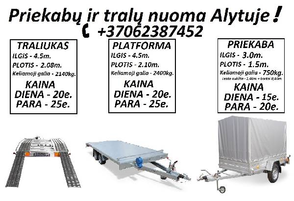 PLATFORMOS NUOMA ! PLATFORMOS MATMENYS: ILGIS 4.50m PLOTIS 2.10m. Keliamoji galia 2400kg ( Patogu vežti lentas, kubilus, metalo gaminius, traktoriukus, žoliapjovės, valtis, automobilius, keturačius ir t.t. ) Diena: 20e. / Para: 25e. PRIEKABOS NUOMA! PRIEKABOS MATMENYS: ( su tentu aukštis nuo grindų 1.80m. ) ILGIS 3.00m PLOTIS 1.50m. Keliamoji galia 750kg Diena: 15e. / Para: 20e. TRALIUKO NUOMA! TRALIUKO MATMENYS: ILGIS 4.50m PLOTIS 2.08m. Keliamoji galia 2140kg. Diena: 20e. / Para: 25e. Skambinkite: +37062387452 TECHNINĖ PAGALBA KELYJE nuo 20e. +37062387452 Kaina: 25 EUR