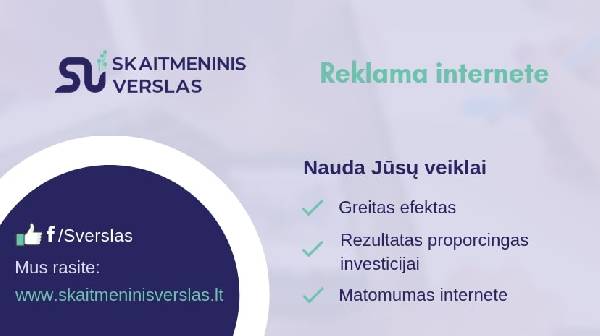 - Naujokas internete ir Jums reikia greito sprendimo su sąlyginai nedidelėmis investicijomis - Jūsų veikla sezoniška ir nereikalingas sunkus ilgalaikis įdirbis ilgalaikiams rezultatams pasiekti Reklama internete jums pasiūlys: > Greitą sprendimą > Sutaupys pinigų ir laiko > Pagalba, sužinant kokia auditorija ir ko ieško (naudinga planuojant vėlesnius veiksmus) > Nereikalauja priežiūros Reklama internete veikia proporcingai finansinėms investicijoms. Kuo daugiau pinigų investuosite, tuo didesnę grąžą gausite. Už nedidelį mokestį mūsų komanda pasirūpins, kad jūsų pageidaujama reklama internete būtų paleista ir optimizuota tinkamai, geriausiam rezultatui už mažiausią kainą pasiekti. Be to sukursime patrauklių reklaminių paveikslėlių (banerių) ir pakonsultuosime kokį turinį ir kur platinti. Daugiau pasiūlymų rasite: https://skaitmeninisverslas.lt Facebook: https://www.facebook.com/Sverslas/