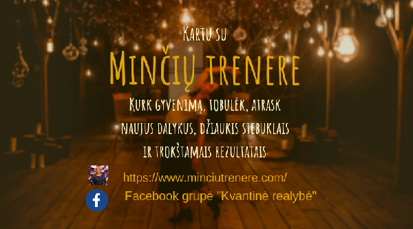 Sėkmė, pinigai, gausa, sveikata - tai visų trokštamas gėris. Treniruokite savo protą, mintis ir taikykite realiame gyvenime per praktiką, kuriant tai, apie ką svajojate. Speciali autorinė programa ugdo sąmoningumą Jūsų žodžių ir veiksmų. Minčių trenerės metodika paprasta ir lengva, nereikalaujanti daug laiko, tačiau rezultatai pranoksta lūkesčius. Minčių trenerė moteris, sukūrusi savo svajonių sodybą, automobilį ir net vyrą, padeda kitiems siekti rezultatų.