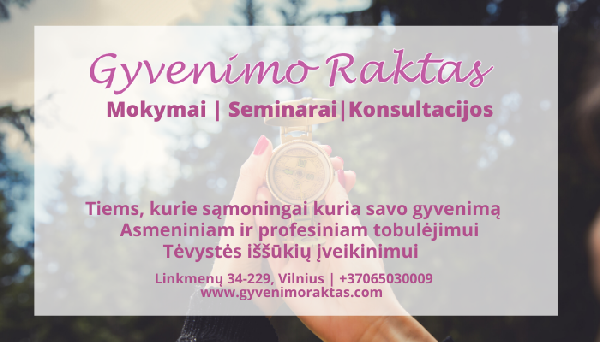 tėvystės klausimus. Čia jūs galite rasti sprendimus, reikalingus gyventi džiaugsmingą ir sąmoningą gyvenimą. Gyvenimo raktas paslaugos jums: asmeninės psichologinės konsultacijos aktualia tema; mokymai asmeniniam tobulėjimui; seminarai profesiniam augimui; konsultacijos kūdikio laukiantiems ir jau auginantiems tėvams; kassavaitiniai užsiėmimai nėštukėms. Užsukite į www.gyvenimoraktas.com svetainę, išsirinkite sau tinkamiausią temą ir skirkite laiko sau.