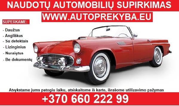 - Daužtus - Skendusius - Nurašytus - Lizinginius - Be draudimo - Be TA - Angliškus - Ilgai stovėjusius - Be dokumentų Išrašome utilizavimo pažymas, atvykstame jums patogiu laiku visoje Lietuvoje, nesikabinėjame prie defektų, sutarę kainą telefonu, siunčiame tralą pasiimti. Užpildykite paraišką www.autoprekyba.eu arba susisiekite +37066022299