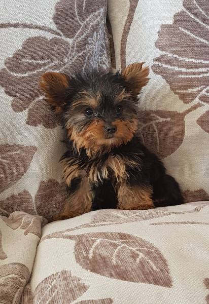 Jorkšyro terjerų šuniukai su kūdikio snukučiu yra visiškai pasiruošę kraustytis.
