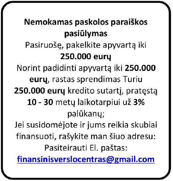 Norint padidinti apyvartą iki 250.000 eurų, rastas sprendimas Turiu 250.000 eurų kredito sutartį, pratęstą 10 - 30 metų laikotarpiui už 3% palūkanų; Jei susidomėjote ir jums reikia skubiai finansuoti, rašykite man šiuo adresu: Pasiteirauti El. paštas: finansinisverslocentras@gmail.com Kaina: 10 EUR