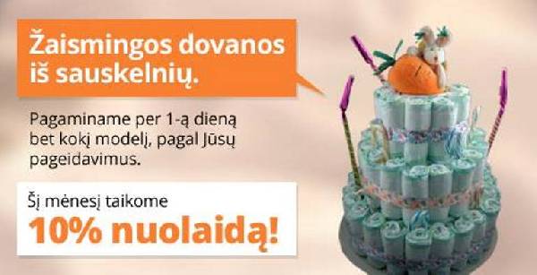 Iškepsim bet kokį tortą ar dovanėlę iš sauskelnių, tik praneškit, ko pageidaujat. Jei norit, patys pristatykit ingridientus. Tortą suvyniosim - įpakavimas leis jums dovaną lengvai transportuoti. Siunčiame į visus Lietuvos miestus. Mus aplankyti galite Kęstučio g. 59-52, Kaunas; Darbo laikas: I-V (13.00-18.00)