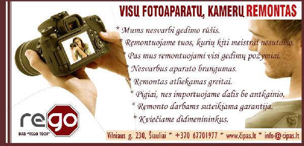 ŠALINAME FOTOAPARATŲ/VAIZDO KAMERŲ užstrigusių, sulankstytų objektyvų, blykstės, matricų, ekranų, jungčių, lanksčių (šleifų) jungčių, išlaužtų lizdų ir kitus gedimus. Remontuojame net pačias profesionaliausias foto/vaizdo kameras. ŠALINAMOS ŠIOS FOTO/VAIZDO KAMERŲ GEDIMŲ PRIEŽASTYS: - neįsijungia, - įsijungia, bet objektyvas "neišvažiuoja", - įsijungia, bet nefotografuoja/nefilmuoja, - skleidžia neįprastą garsą, - objektyvas "išvažiuoja" ir "grįžta", - sudužo ekranas, - neryškus vaizdas ekrane, - "dingo" spalvos fotografijose, - baltos/juodos fotografijos, - fotografijos su linijomis, - ekrane meta užrašą "error", - neveikia valdymo mygtukai, - nesuveikia blykstė, - "neatpažįsta" atminties kortelės, - greitai išsenka baterijos, - "neprisijungia" prie kompiuterio, - įkrito į smėlį, - prisikaupė dulkių, - neveikia priedai, - sulūžo korpuso komponentai. Canon, Fujifilm, Nikon, Pentax, Sony, Panasonic, Sigma, Olympus, Ricoh, DxO ir t.t. KOKYBIŠKAI - Būkite tikri, kad mes padarysime viską, kad Jūs gautumėte kokybiškas paslaugas ir ateityje vėl pas mus apsilankytumėte. SAUGIAI - Palikdami savo FOTO/VIDEO techinką remontui, mes ją užsiregistruosime sistemoje, kurioje Jūs patys galėste stebėti remonto eigą. GARANTIJA - suteikiame iki 6 mėn garantiją. Visos keičiamos detalės yra ORIGINALIOS. MUS RASITE ADRESU: UAB Rego Tech Vilniaus g. 230, Šiauliai (patogus privaziavimas) El.p. info@cipas.lt Skype: cipas.lt Mob.: +37067701977 Darbo laikas: I-V: 9-18 val., VI: 9-14 val. Daugiau informacijos rasite mūsų internetinėje svetainėje: www.cipas.lt *Nuolatiniams klientams taikome NUOLAIDAS.* VISKAS APIE UAB REGO TECH: Remontuojame nešiojamus bei stacionarius kompiuterius, foto/ vaizdo kameras, GPS navigacijas, spausdintuvus, kopijuoklius, pildome kasetes. Prekiaujame kompiuteriais, kompiuterių dalimis ir komponentais, navigacijomis, jų priedais, parkavimo sistemomis, vaizdo registratoriais, laisvųjų rankų įrangomis, kameromis. Superkame įvairią kompiuterinę techniką. Jei turite nenaudojamos technikos susisiekite nurodytais kontaktais ir aptarsime preliminarią supirkimo kainą. Kompiuterių remontas Šiauliuose. Kaina: 5 EUR ![]() ![]() ![]() ![]() ![]() Kiti šio autoriaus skelbimai Kiti skelbimai iš kategorijos "Paslaugos" |