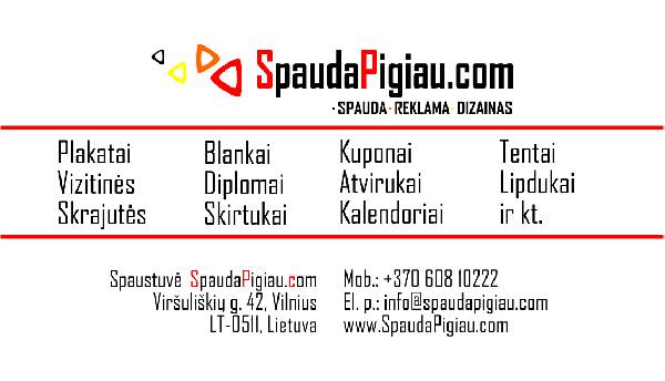 Vertiname aukštą kokybę, esame lankstūs kliento poreikiams ir galimybėms, visada randame geriausią sprendimą Jūsų reklamai. Klientų patogumui turime didelį asortimentą paslaugų. Gaminame vizitines korteles, skrajutes, lankstinukus, bukletus, meniu, atvirutes, kvietimus, lipdukus, plakatus, etiketes, aplankus, blankus, bloknotus, dovanų kuponus, diplomus, padėkas, bilietus, fototapetus, fotosieneles, drobes, magnetus, planšetus, rašiklius, puodelius, prijuostes, marškinėlius, džemperius, rūbinių numerėlius, hangerius ant rankenų, skirtukus knygoms, pieštukus, stalo korteles, saugos liemenes, vokus, kalendorius - 1-os, 2-jų, 3-jų dalių sieninius, stalinius, kišeninius, reklaminius skydus, tentus, reklamą ant automobilių, vitrinų, informacinius stendus, gatvių lenteles, nuorodų lenteles. Turite idėją, bet nežinote kaip ją įgyvendinti? Kreipkitės, mūsų specialistai padės rasti tinkamiausią sprendimą jai įgyvendinti. Produkciją siunčiame kurjeriu arba paštu į visus Lietuvos miestus ir kitas šalis. Darbo laikas I-V nuo 9 iki 18 val. SPAUSTUVĖ SpaudaPigiauCom Viršuliškių g. 42, LT-05112 Vilnius, (PC "Mada", įėjimas iš Viršuliškių g.) Mob.: 8 608 10222 El.p.: info@spaudapigiau.com www.spaudapigiau.com Kaina: 3 EUR