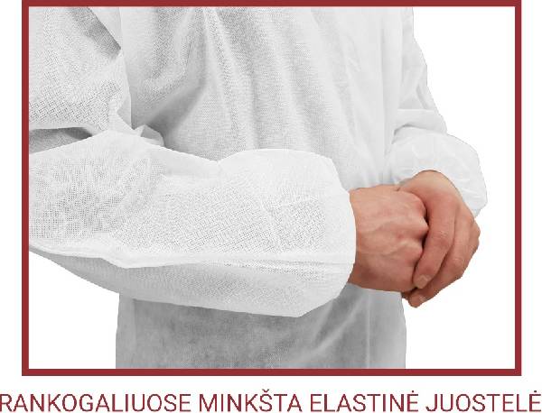 Baltos spalvos vienkartiniai chalatai ilgomis rankovėmis. Chalatai užrišami virvele ties kaklu ir juosmeniu,